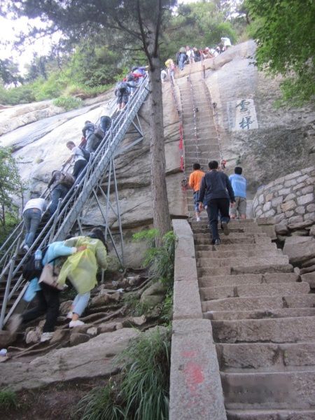 众人清醒之后,我们仍旧向上,登上东峰,其实东峰离我们已经十分得近了╮(╯▽╰)╭,路过垂直90度的云梯,旁边放着一个70度的铁梯,专为女性提供。