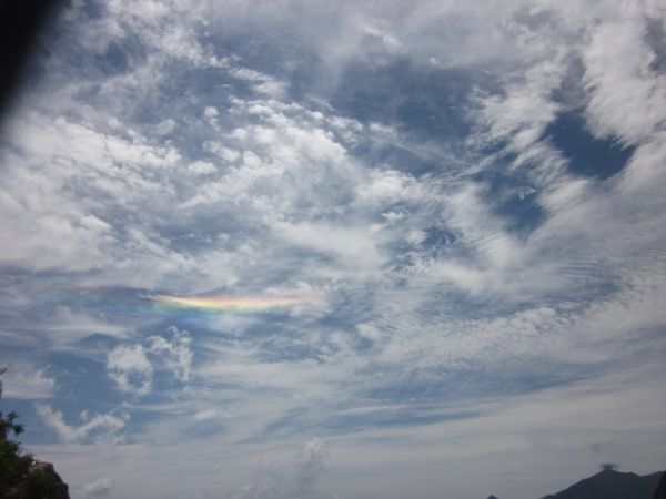 最后,往回爬的时候,天空出现了奇异的景观,大白天的,蓝天白云的,居然出现比彩霞还美像彩虹一样的云霞,我惊异的叫,看天上出现彩虹了!