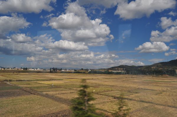 丽江的车,很不错的车子,路况也很好,两个司机长得和穿得都很像港产片的的保镖,还一直在玩漂移。睡醒看看窗外,湛蓝湛蓝的天空飘着白云,那些白云就像低飞的天使,时不时出来巡游谋杀我的快门。路过一片山区,很不错的一片梯田,一山一山的,即使已经收割完,也还是可以想象她的美丽,几个人在地里聚着拉家常,一个大村子坐落在梯田里,这样生活也不错。中途停车吃饭时遇上两个从丽江出来的一对小情侣,同乡,搭讪时,他们建议去一棵树找拼车去