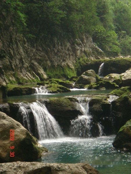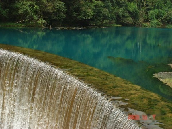 小七孔指的是一座七孔桥,它在古代是贵州和广西的交界处。 走过小七孔桥,你便脚踏两省了。小七孔的景点都是沿山路分布的,最好的游览方法便是坐着当地农民赶着的驴车漫步其中。一路上,一侧是山,一侧是水,时而能看到参天的大树倒栽葱地倒在水里。树的根部已经枯死,而泡在水中的枝干却有的发芽并长出了绿色的枝叶,横漂在水中。尤其美的是这里的水,虽然是一条长长的河,间隔不久便会有很大的落差,看上去是由一个接一个的小瀑布组成。有时落差间隔很小,一层层的瀑布便连成了一片,白花花的水帘从绿色的石头上流过,流入清澈见底的河流当中,其间还有许多水灵灵的水草。且不说如此的美景,就是这一路上的水声也足以让人心旷神怡了。