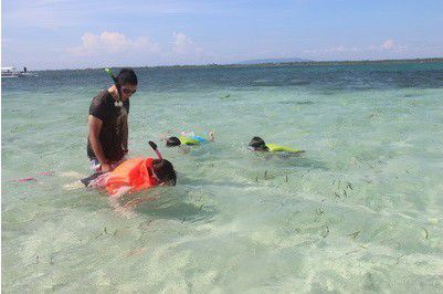 balicasag岛号称是菲律宾最好的潜点之一,不会游泳的我浮潜还是想试试的。带好潜水镜,咬好呼吸管,我战战兢兢的下水了,谁知道水的浮力让我完全不受控制,我手扒着船边,腿浮起来了,整个人睡在了海面上。顿时慌了神!!!2个小菲奋力地想让我放手,我不肯,整个海面就听到我一个人杀猪般的叫声。。。