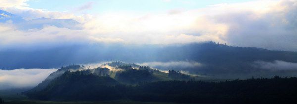 这个山洼就像一口锅,晨雾在阳光下就像是锅里沸腾的水,真是奇妙