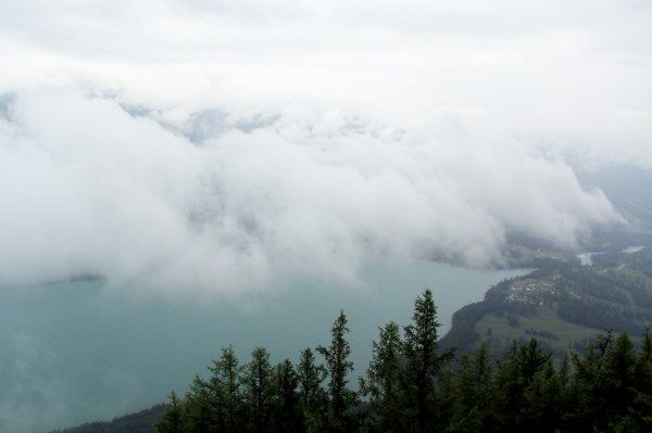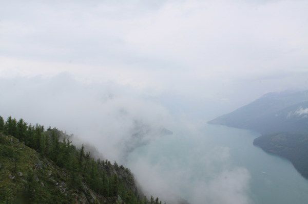 到了观鱼台雨不但没减小,雾还都起来了,下面的喀纳斯湖慢慢地被雾完全笼罩,什么也看不到了。我们觉得不甘心,所以在亭子里面等着,等了一拨又一拨的游客,几个小时后,还是没有改观,而且冷死了,我们最厚就是T恤+衬衣,都穿得不多,冻得嘴唇都发紫了,担心小孩子生病,所以不得不下山了,观鱼台上面啥也没拍着。