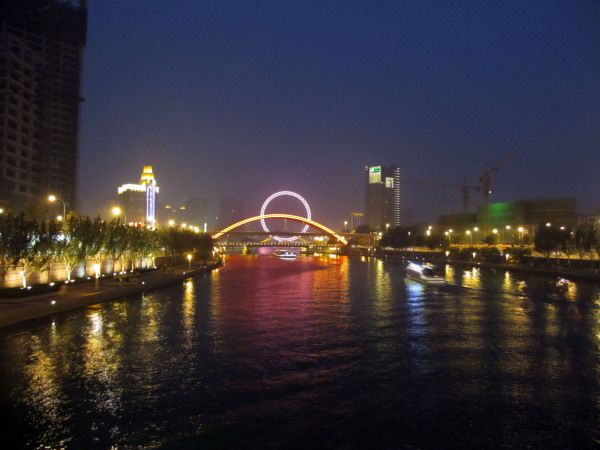 恐高,所以压根就没打算花钱去坐,远观就可以了,不过我发现天津的河水好碧绿啊!!跟广州珠江一样,有轮船夜游。不远处有条江边烧烤街,没吃,天气太热,没兴趣!不过那里人很多很多……