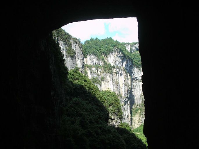 天生三桥之黑龙桥 - 因其拱洞幽深暗黑,似有一条黑龙蜿蜒于洞顶而得名。桥面高223m,平均拱孔高116m,为三桥中最高者;桥厚107m;拱孔跨度16-49m;桥面宽达193m,亦为三桥中宽度最大者。洞壁北侧发育有雾泉、珍珠泉、一线泉、三迭泉等4处悬挂泉。