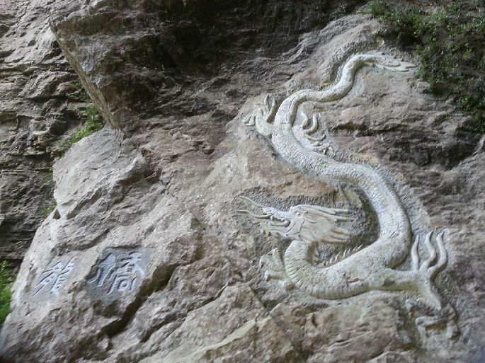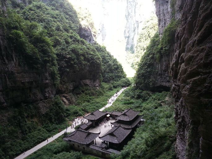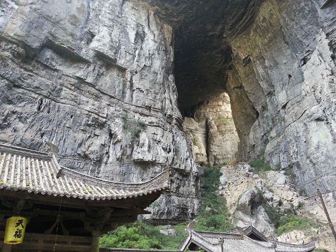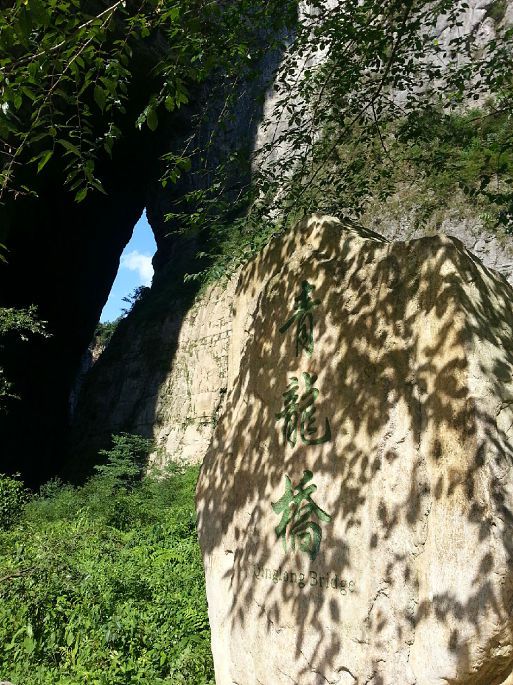 天生三桥之青龙桥-又名中龙桥,因雨后飞瀑自桥面倾泻成雾,日照成彩虹,似青龙扶摇直上而得名。桥面高度为281m,是三座天生桥中最高者;平均拱孔高度103m;桥面厚度168m,拱孔跨度13-58m,平均31m;桥面宽124m。青龙桥以高大著称,达281m,为世界喀斯特天生桥高度之最。