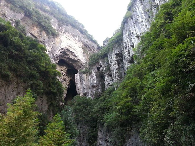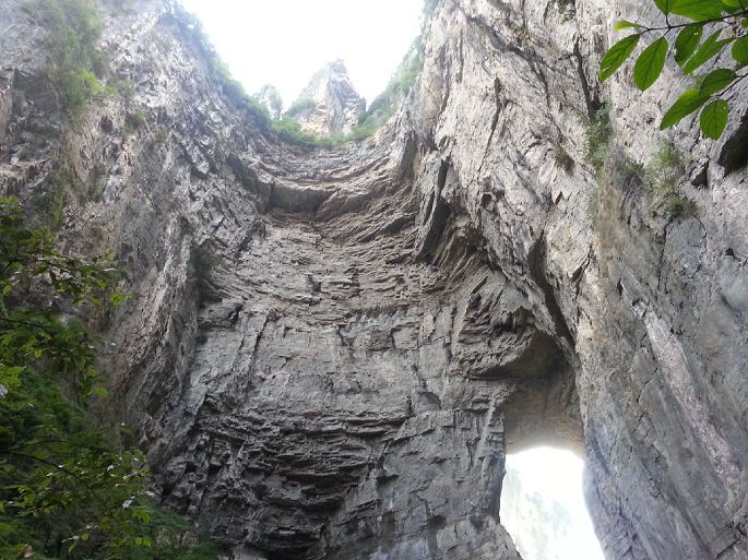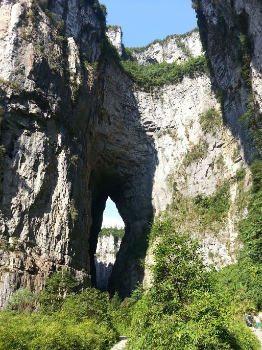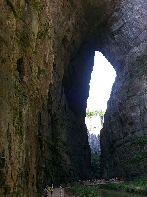 天生三桥之天龙桥,又名头道桥,高大厚重、磅礴气势,以雄壮称奇。桥高235m,桥厚150m,平均拱桥高度96m。拱孔跨度20-75m,平均34m,桥面宽度147m。