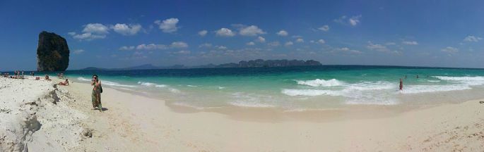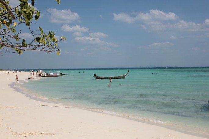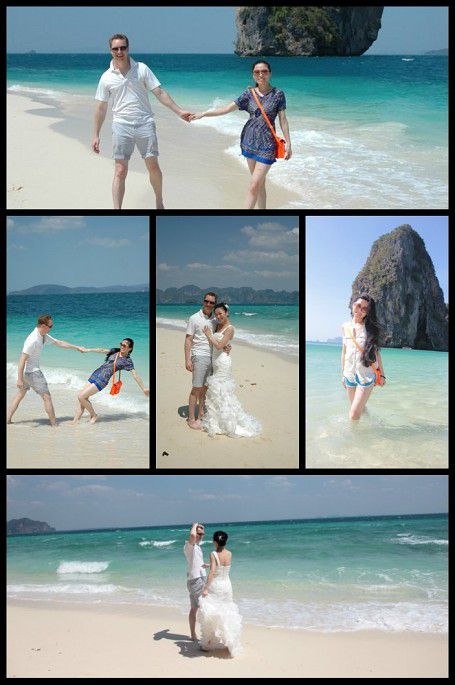 四岛游,2500铢,旅游点比较价格后选择的,出海包的长尾船,早10点至晚4点,包水果(菠萝)和瓶装水,不含午餐和进岛费,早饭吃好,其实不需要午餐,带点零食上船。名字没特别去记,没搜错的话,就是这四个,【莫岛Moh island】【波达岛poda island】【管子岛Tube island】【鸡岛Chicken island】。先去的那个有攀岩的岛,沙滩也不错,人蛮多。风景最美的那个应该就是波达岛poda island了,听说中心有一块圈起来的地方,进里面的话,要额外收费,本身海边沙滩是免费的。在岛上可以遥望到第三个岛,但真正去时,那水面下一片片的礁石啊,没鞋子的,就别下船折磨自己的脚了。最后一个是鸡岛,是浮潜的地方。 因为是单独包船,停留时间比较自由,我在岛上拍了N---多张的照片,相信大家这时候都一定是狂拍族的。