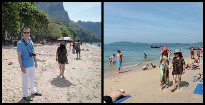 只能说,尽管是天气凉爽的一月底了,出门前还是乖乖地做好防晒工作吧,除非你就是铁了心想把自己晒黑的主儿。第一天在曼谷的周末市场闲逛,掉以轻心了,出门忘了喷,虽然一半的时间还在棚下呢,结果晚上回去后,胸前就出现了明显的V字红印,脖子也是重灾区,事后开始脱皮,即便接下来的每次外出,都一层一层的喷防晒,但为时已晚了。其实晒黑点无所谓,就怕晒坏了,和那些在沙滩上狂晒的不同,我们的辨认度非常高,如果当时在沙滩上看到一位年纪在六十上下,头戴遮阳镜,大沿的遮阳帽,外加一把防晒雨伞的人,那就是我妈妈了,绝对好认。