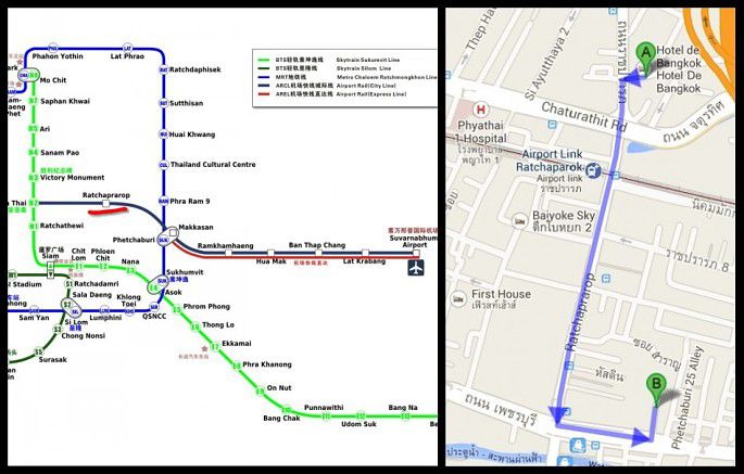 曼谷首晚入住的酒店,在机场快线RATCHAPROROP站北面附近5分钟的路程,交通方便,去新机场有直达快线30分钟,去旧机场300铢