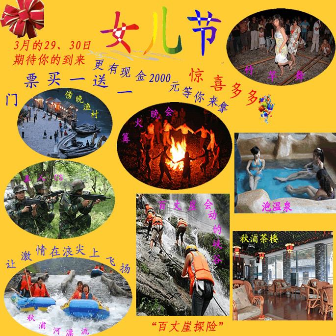 踏青三月、秋浦河风景区隆重举办“女儿节”活动 安徽石台秋浦渔村是女儿村遗址,相传汉末王允经过渔村钓鱼台,看到一名女婴被丢弃便抱起带回长安收作义女,这便是中国古代四大美女之一的貂蝉。此后,村中新婚夫妇便多生女孩,且个个天生丽质,貌美如花,女儿村由此声名女儿村为庆祝女儿节的到来,女儿村的女儿们将在三月的周末隆重举办节日活动,靓丽梳妆,招才纳婿,单身的帅哥们还在忧郁什么,机会不多,能不能抱得美人归,就看你的表现了,看你能否赢得女儿村的女儿们的芳心。 活动当日我们欢迎广大的单身男女前来现场,我们给你舞台,给你创造机会,告别单身就在我们秋浦河女儿村 更有百丈崖景区、秋浦渔村、秋浦河漂流独家赞助,每逢女儿节,门票买一送一女儿节还可于欣赏到女儿村的女儿们跳竹竿舞、兔子舞、对歌、捕鱼、美女赛龙舟 一旦与我们女儿村的女儿们成功配对,我公司将独家赞助2000元人民币作为奖励 3月的29、30日期待你的到来。