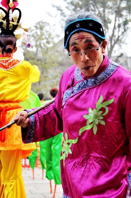 以前每年过年的时候经常会看到街道上有一大队高跷秧歌队表演,这样一直边走边演,可是也不知现在是因为交通拥堵还是城管控制,反正街道上是看不到了,这不古城里有秧歌表演。
