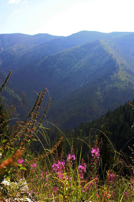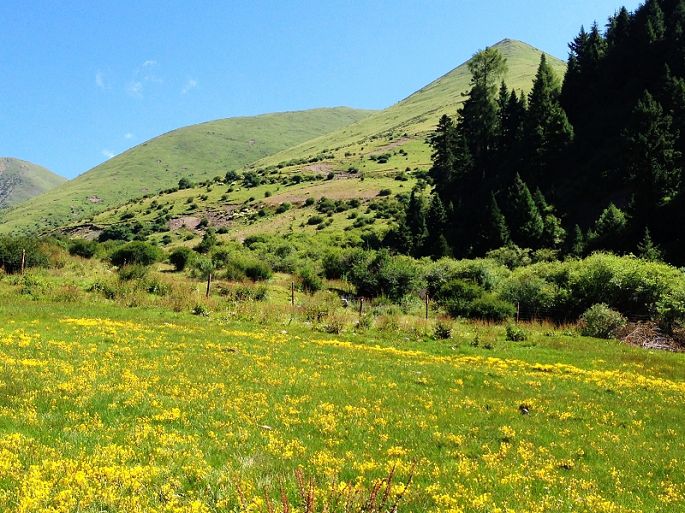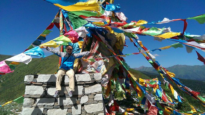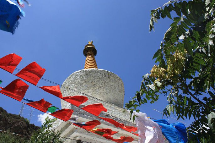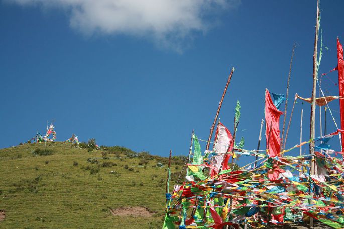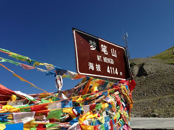 其实一路都是景点,在到达梦笔山垭口时,大家兴奋了!美丽的经幡在蓝天下显得十分耀眼!旷阔的视野让我们有一种一览众山小的感觉!天上偶尔有一两朵白云让人感觉如同在画里一般!车子开过一处开满小花的山坡,大家迫不及待地下车留影!