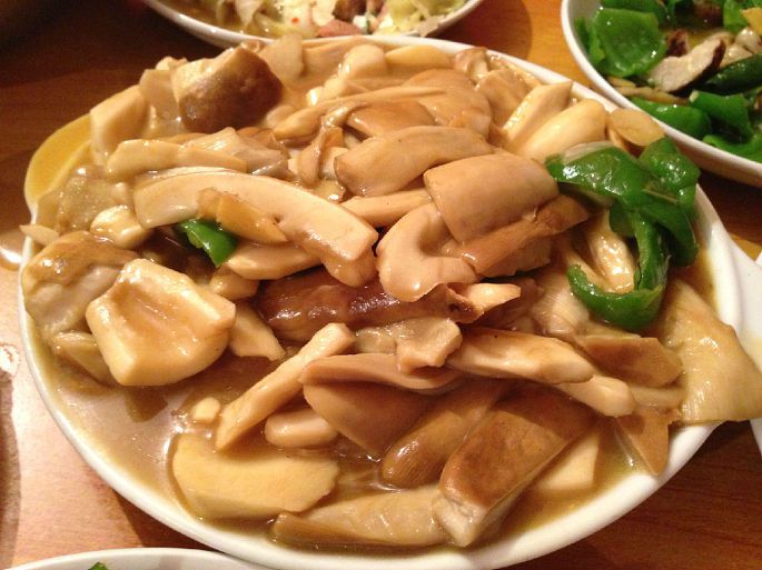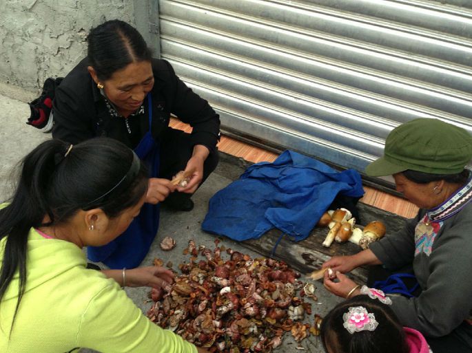 阵雨来得猛去的也快。一会儿,又不下了。我们一伙人无聊的在日隆镇上进行饭前散步。日隆镇很小,也就几条街,街边都开着大大小小的旅社,从外观看都装修得不错。在街上我们看到一些当地人正在清理刚采来的菌子,应该都是山里野生的。于是,猩猩地走上前,问着价格:20元一袋。其实很便宜啦!于是全部拿下。来到住宿地,让老板帮忙洗了,当场炒了就吃,味道当然还是很不错的啊!
