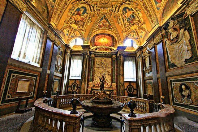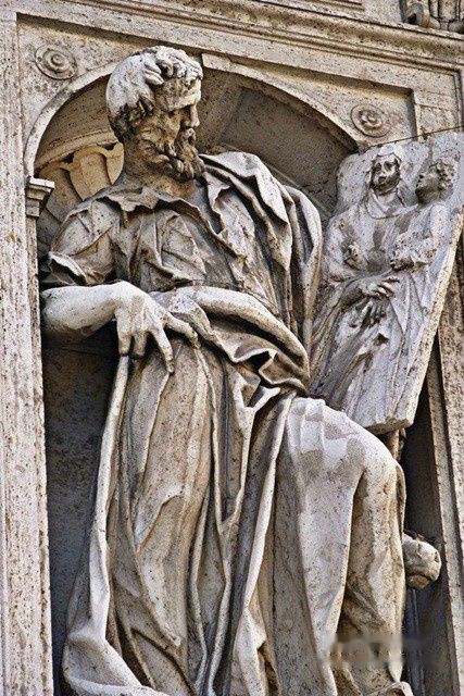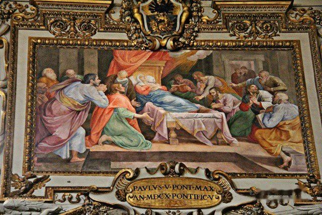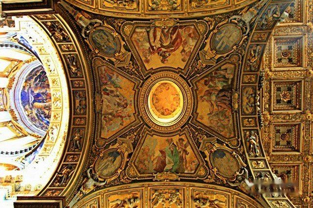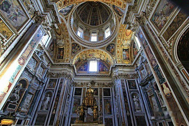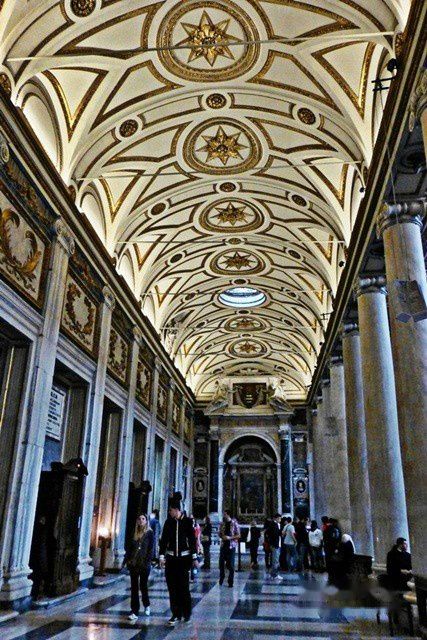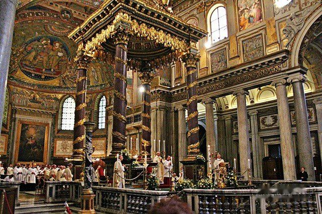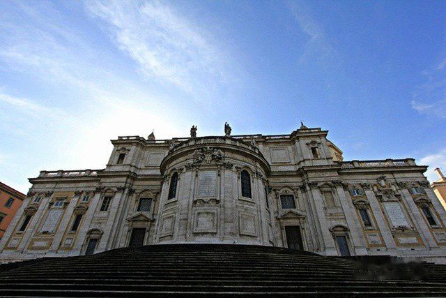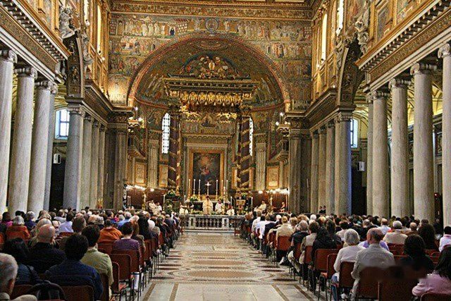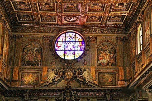 教堂正面是朝东南方向的,是18世纪兴建的。它位于罗马火车站西南500米处,很容易找到。走进静谧的教堂,感觉非常精致而端庄。它的中殿是属于5世纪建筑,天花板富丽堂皇,克斯马蒂式镶嵌地砖是中世纪的表征,花纹精美。36根圆柱是从古代罗马的神殿搬来的,以列柱支持水平梁是典型的初期基督教教堂建筑手法。