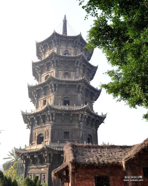 东塔名“镇国塔”,咸通六年(公元865年)由倡建者文偁禅师建成五层木塔。前后经过几次毁坏与重修,易木为砖。至嘉熙二年(公元1238年)本洪法师才易砖为石,后由法权法师,天锡法师继造,前后经十年才完工。东塔通高48.24米,塔平面分回廊、外壁、塔内回廊和塔心八角柱四部 分。塔为框架式的结构。正中的塔心柱直贯于各层,是全塔的支撑。各层塔心柱上的八个转角处均架有石梁,搭连于2米厚的塔壁和倚柱,顶柱的护斗出华拱层层托出,缩小石梁跨度。石梁与粱托如同斧凿,榫眼接合,使塔心与塔壁的应力连结相依形成一体,大大加强了塔身的牢固性。塔壁使用加工雕琢的花岗岩,以纵横交错的方法叠砌,计算精确,筑工缜密。稳固的基础,配置着符合力学原理的坚实塔心,使这座重达一万多吨的建筑物虽经历700多年风霜雨露而巍然不动。公元1604年的八级地震,也无法动摇动它的根基。石塔不但坚固无比,而且造型精致。塔檐呈弯弧状向外伸展,檐角高翘,使塔身有凌空欲飞的态势,显得轻盈。每一层各设四个门和四个龛,逐层互换。这样既平均分散重力,又可使塔的外型更加生动和美观。每层塔檐角各系铜铎一枚,微风吹动之时,铎1声叮咚,悦耳怡人。塔顶有八条大铁链,连结八个翘角与刹顶,显得气势磅礴,紫气飘摇。每一层塔壁上还刻有十六幅浮雕,分别刻有人天乘,声闻乘、缘觉乘、菩萨乘和佛乘,共计80幅栩翎如生的人物雕像。刀工细腻,线条流畅,巧夺天工。东塔已于1997年人选全国四大名塔邮票,可称得上:石塔之王。