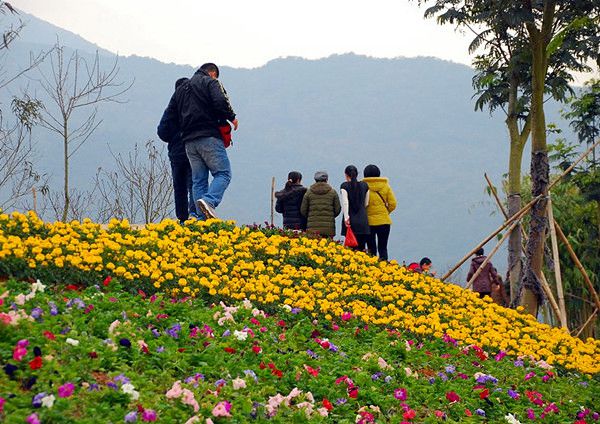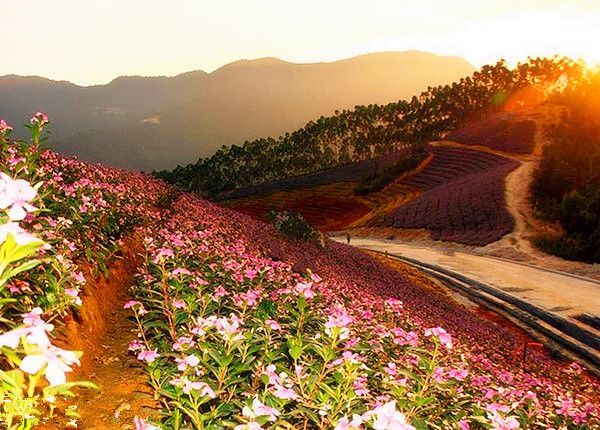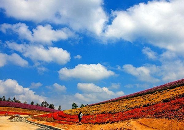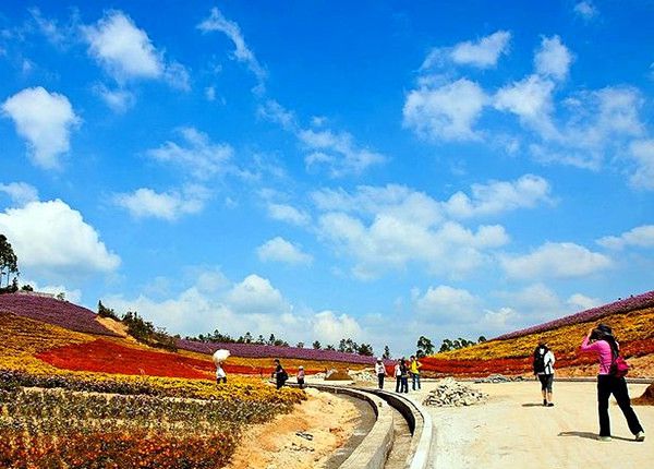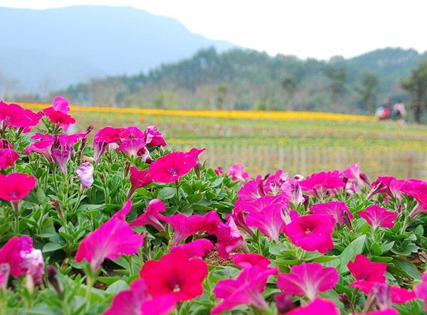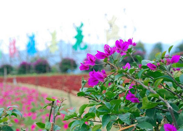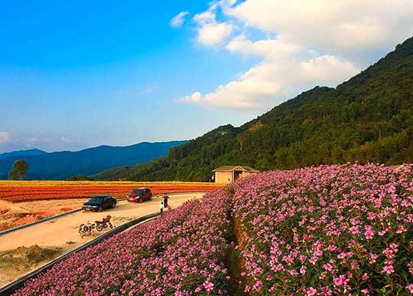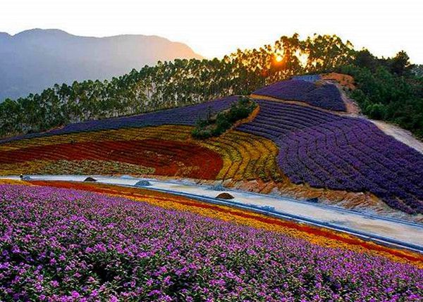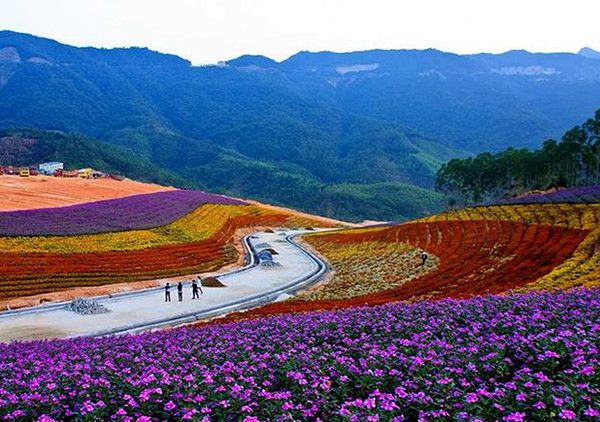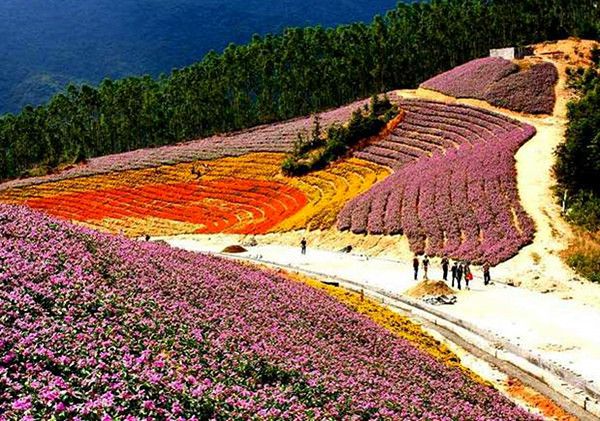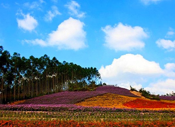 十里蓝山花海景区位于福建省漳州长泰县,这里300亩的山地,顺着起伏的山势,人工种植的各色草花、油菜花、三角梅、紫薇等花卉竞相开放,形成一望无际的色彩斑斓的风景线。。。