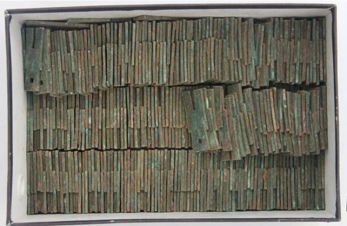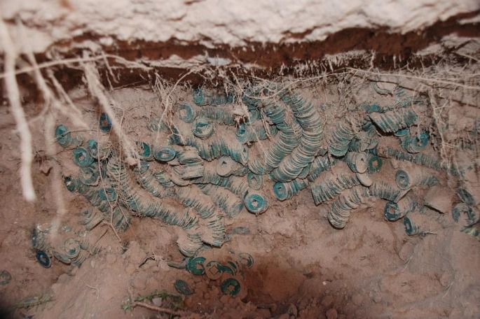 近日,内蒙古鄂尔多斯市杭锦旗境内的霍洛柴登古城内发现西汉及新莽时期的铸钱作坊遗址,出土大量古钱币。该遗址曾在 2012年8月被盗,之后开始清理挖掘,追回被盗古钱币达数千公斤。经清理发掘在铸钱作坊遗址内发现铸币窑址4座。图为出土的部分货币。
