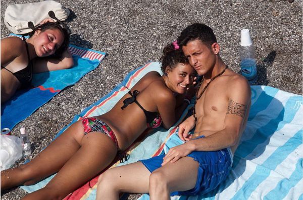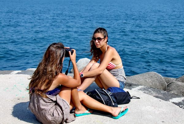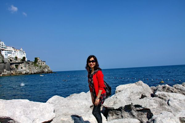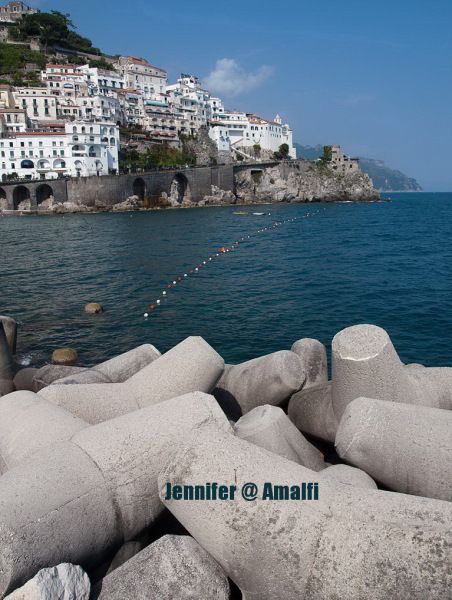 阿马尔菲的海滩实在是小,而且多是付费的,不付费的几乎没有沙子,看到人们就在防波堤上铺上毛巾,照样晒得自得其乐。海滩本身实在乏善可陈,但,海水颜色真是漂亮,随着海岸的深浅,水的颜色会逐渐变化,淡蓝、粉蓝、湖蓝、深蓝、接近黑的蓝,晕染成碧海蓝天里迷人的色调。