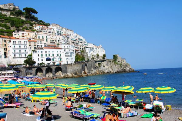 沙滩小而浅,被一弯碧蓝的海水拥着,严格的说并不是沙滩,而是焦黑的碎石滩。人都说,铺满白沙的海滩才最浪漫,但对于曾是海事强镇的阿马尔菲小城来说,那样的浪漫太过孱弱,也只有那嶙峋矗立的悬崖峭壁、黑色的沙滩,才能配得上它昔日海上共和国威镇八方的风华气度。