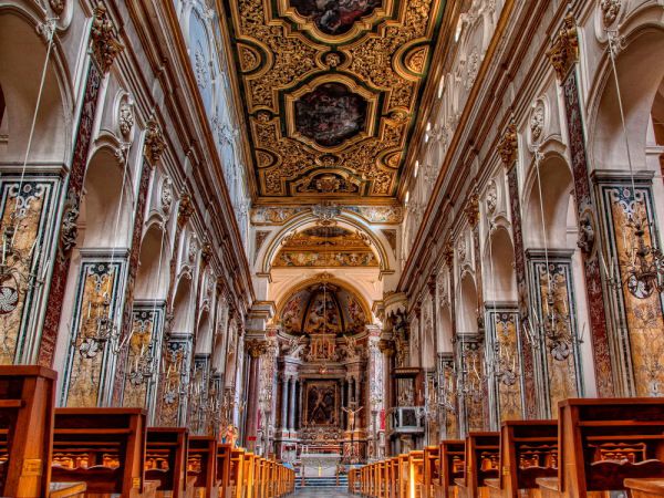 教堂内部让我们极为惊喜,中庭庭院深深,四周是典型伊斯兰双叶装饰风格的回廊,寂静的环形回廊里有很多壁画和石棺,埋着昔日阿马尔菲公国的王公贵族。教堂内部富丽堂皇,巴洛克的装饰让大厅多了细致美,不过宝贝却都在教堂的地穴里,那里存放着耶稣的第一个门徒---圣安德鲁的遗骨。圣安德鲁是圣彼得的兄弟,当年传教至小亚细亚,被钉死在十字架上殉道。死后被埋葬在拜占庭帝国的首都康斯坦丁堡(如今的伊斯坦布尔),康斯坦丁堡沦陷之后遭到洗劫,信徒们就把他的遗骨带回意大利,在此安葬。教堂地穴一眼看去就气派非凡,可惜藏有遗骨的匣子无缘得见,据说只有在重要的宗教活动中才会拿出来陈列。