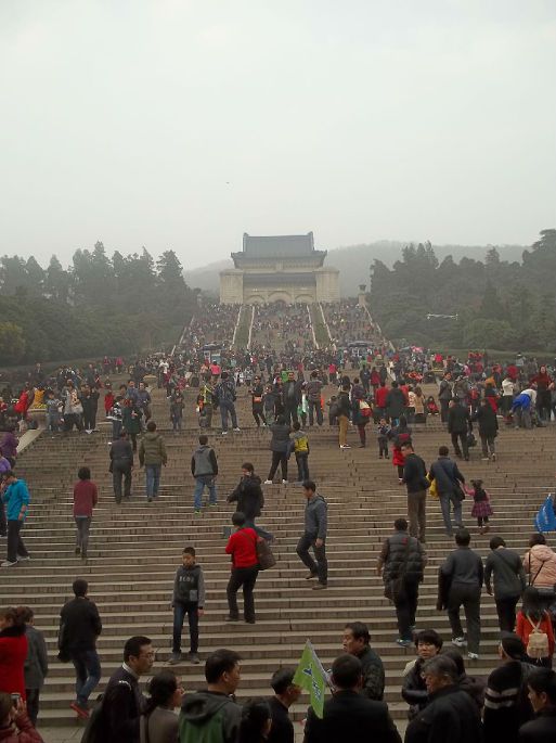 第二天的中山陵是一个大工程,所以建议要去的亲们要提前换一双舒适的运动鞋或者平底鞋,另带上少量吃的喝的。坐上9路公交车直达中山陵站后,跟着人流走,站台到景区距离至少有半小时的路程,如果你吃不消可以坐观光车,如果能吃得消最好走一趟体验一下,对了中山陵周一是不开放的,应该是南京几乎免费的景区周一都是不开放的。中山陵有392个阶梯,如果你来的路上时走路的,那这几百个阶梯可以说是小case了。也许正因为是免费的,所以景区里可以说是人海了。
