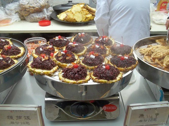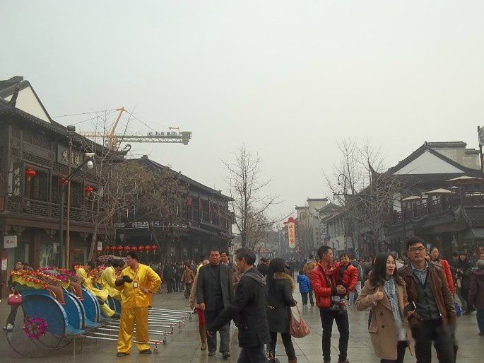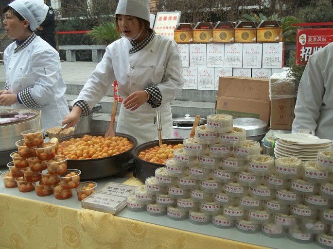 景区一般都会有小吃街,夫子庙的小吃街有点点零散,也许是因为人流不均,不过也有单独的一条小吃街,要说南京最有特色的小吃就是鸭血粉丝和蟹黄汤包,几乎每家都有,还有就是臭豆腐,如果要带回家的特产一般是选盐水鸭,听说正宗的盐水鸭是桂花牌的,不过最近禽流感严重,而且带回去太重了,我只好放弃了。
