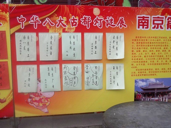 南京作为六朝古都有浓厚的文化底蕴,江南贡院就是古代文人科试之地,看下面出的有关几个南京的灯谜,我发现我弱爆了,我对不起语文老师,对不起中国文化啊,还好我看周围的人文化水平其实也没我高。如果各位亲有兴趣自个儿记录下来好好琢磨琢磨呗。