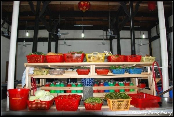 18:00,卢老伯和餐馆老板交代了一下就走了,我们对着一排菜筐点完菜,边喝茶边环视这餐馆的格局。餐馆有两层,全部是木结构,木制天花板也就是楼上的地板,中间有个天井。屋子中央的架子上摆了一圈蔬菜筐,在这里看着点菜。