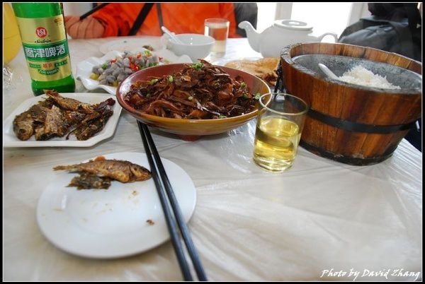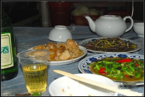 我们点了粉蒸肉、水芹菜木耳炒腊肉、蒜蓉炒当地的一种叫厥根菜的野菜、清明才有的清明果、一瓶南昌出的啤酒,共73元。野菜有股味,吃不惯,不过比鱼腥草好吃多了,粉蒸肉太肥,只能吃下面的春笋。清明果是当地清明时节家家都要做的一种小吃,用糯米做皮,包上当地叫荍qiao(像韭菜,割了还长)的绿菜、春笋和泡菜上锅蒸。吃了一半想起该给这点失败的菜照一张,腊肉已经吃光了。LP看见餐馆小姑娘吃的糊豆腐挺好,小姑娘就送给我们一碗,味道的确不错(后来我们到哪儿吃饭都要糊豆腐,味道却是都不一样的)。