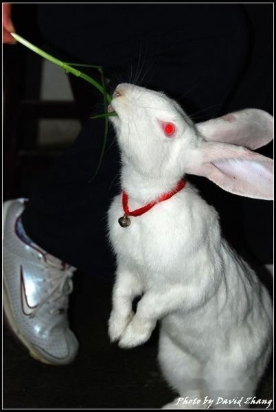 饭间蹦蹦跳跳来了只小白兔,拿菜喂它后它竟恋恋不舍了,总在脚边溜达。
