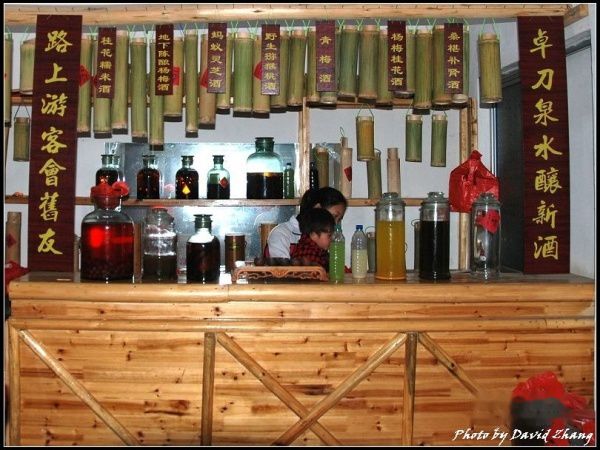 吃完饭到街上转转。下起雨来了,好在下晓起村子不大,街道总共就横三条竖三条。有两条街比较热闹,晚上小店都开着,最多的是木器木雕店,都是用香樟木、檀木和其它木头雕的家具和摆设。还有现炒现卖的茶叶店,自酿的果子酒店。