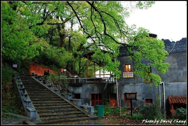 山脚下绿树环抱着一户人家的青瓦白墙,应该上山,向下看一定更美,可惜没有时间了。