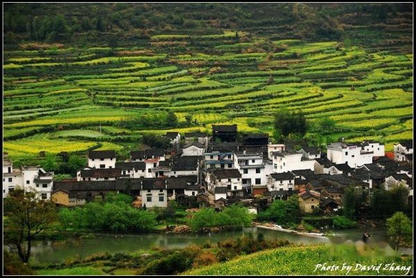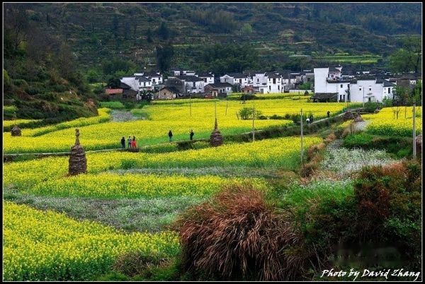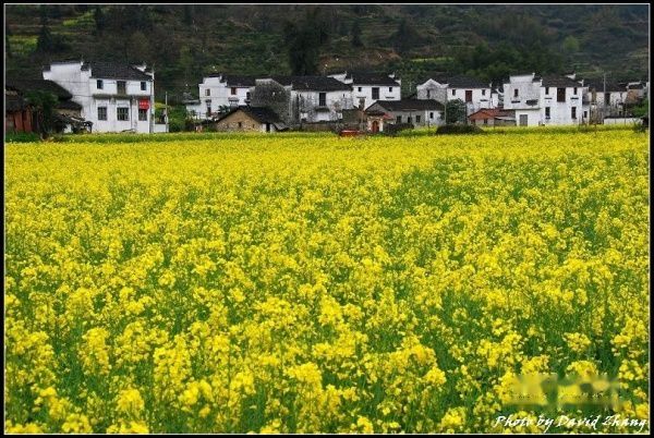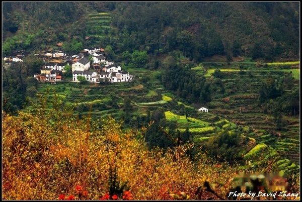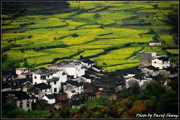 黑瓦白墙的徽派民居夹杂在一片金黄之间,