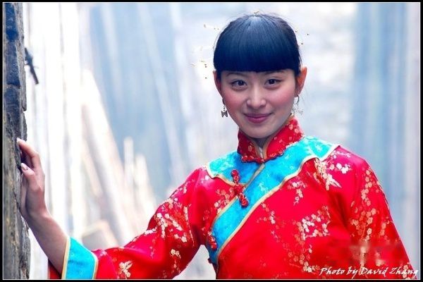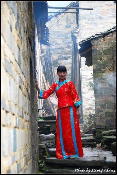 一个新娘一样的红色旗袍女子,站在炊烟袅袅的巷口,