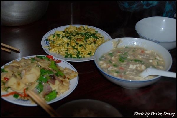 看看已是正午时分,一开店的老妪带我们到小巷深处一人家吃饭。又点了糊豆腐、清明果,还有小葱炒鸡蛋、笋片腊肉、一瓶啤酒和米饭(47元)。