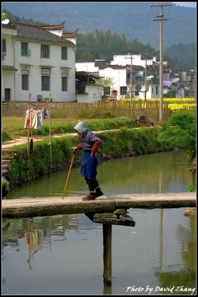 一个老妪拄着拐杖可能是去对岸串门吧。