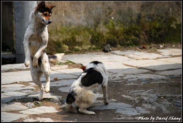 两只狗狗在家门口嬉戏,顽皮可爱。