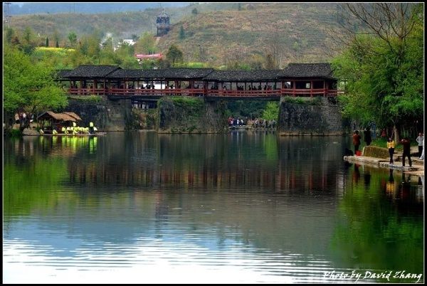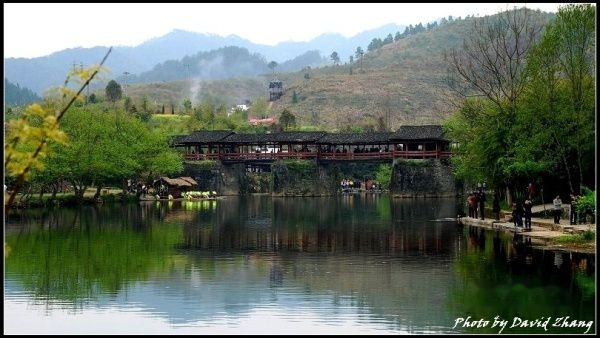 从这里看彩虹桥上游客熙熙攘攘,买了通票的怎能不上桥呢?其实在桥上也就“不识庐山真面目”了。据说桥后面山上的庙也要门票。