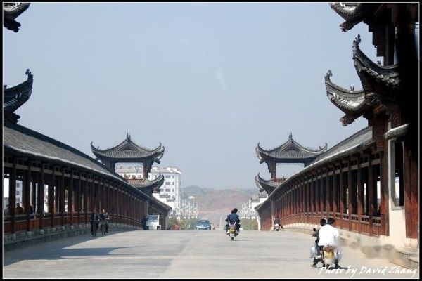 听我们说到清华来只看彩虹桥和老房子,胡老伯先带我们到3楼阳台遥看彩虹桥,彩虹桥被各媒体誉为中国最美的廊桥,是省级重点保护文物。她有着悠久的历史,建于南宋,已有800年。又说带我们去他住的地方看老房子和彩虹桥,说他家的房子木雕最多,保存最完整,看过他家别的房子就不用看了。马上打电话把他孙女叫来看店,带我们上了老街。清华主要有新街、唐代老街两条街,老街上都是老房子,可以走到彩虹桥,我们没打算买票上桥,只想远远看看拍拍照。老伯和看巷子口的小脚侦缉队打了招呼,使我们能走到一个拍彩虹桥比较好的河边,