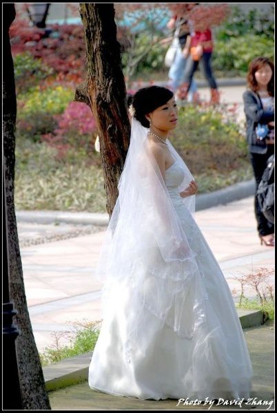 湖边小山坡后面别有洞天,人们有打拳跳操的,有谈情说爱的,还有个新娘在拍婚纱照。