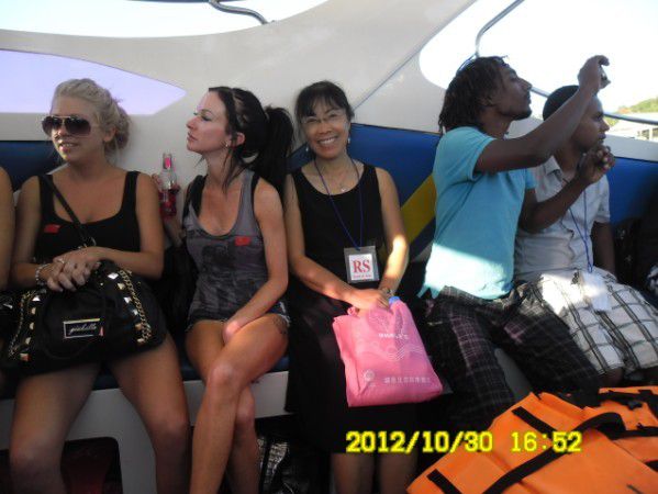 去参加派对要乘坐快艇。在一个不太正规的码头,我们涉水爬上快艇。一船大约40人,我观察了一下,亚洲人面孔大概有6、7个,其余都是西方人。