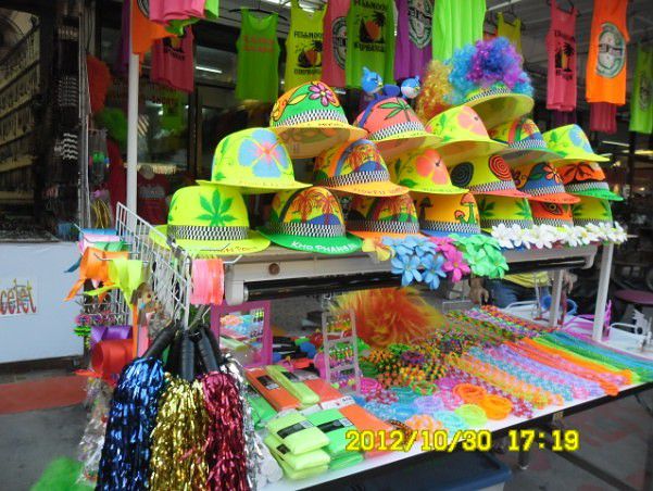 潘干岛是一个面积比苏梅岛略小一点的岛子,与大陆的连接完全靠船。尽管交通非常不便,但由于狂欢活动已经举办了许多年,岛上的商业气息非常浓郁。一进“岛门”,就有泰国人不停地叫喊“TAXI”,“TAXI”!貌似狂欢会场很远的样子。小黄冒充泰国人问一个警察,方知到主会场的海滩只不过十几分钟距离。不明就里的“老外”纷纷爬上被称作“TAXI”的小敞篷车,我们则一边看景一边慢慢步行。说是“看景”,其实就是看商铺。商铺里只卖三大类东西:带荧光的衣帽类服饰;装在小塑料桶里的酒类饮料;烧烤架上香喷喷烤制食品。