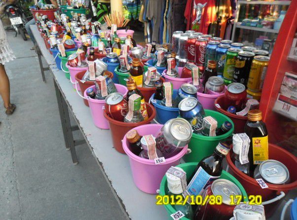 原来,这些都是些卖酒水的摊子,为争夺游客而尖声怪叫。摊主是一水的泰国人,看到不同的游客就喊叫不同的语言。毫无例外,随着我们的靠近,几个摊主争先恐后地喊着“你好”!“你好”!