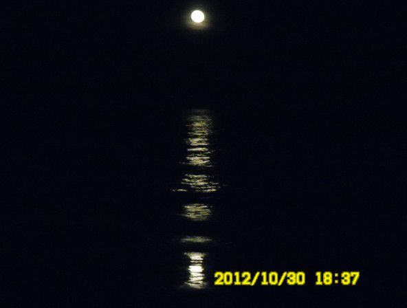 满月派对,当然要有月亮,我使劲睁着一双不管用的近视眼到处找月亮,小黄指着远处突然说:那应该就是月亮吧。我眯着眼仔细看,只见漆黑一片的夜幕中,有一点杏红色一点一点往上拱,颜色越来越浅,光斑也越来越圆,最后变成银色光盘,亮闪闪地挂在对面。因为月亮的反光,才使我分辨出哪是天哪是海(眼睛不给力,是从相机镜头里看到的,呵呵)。