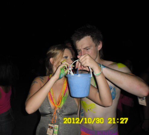 独特的喝酒方式的情侣,身上涂着荧光色。