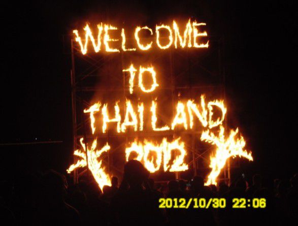 银盘似的圆月升上了中天,9点整,随着一束绿色激光在沙滩右侧山体上打出“Welcome to Thailand(欢迎来到泰国)”“Welcome to phangan(欢迎来到攀安岛)”的字样,狂欢开始了,沙滩上沸腾了。