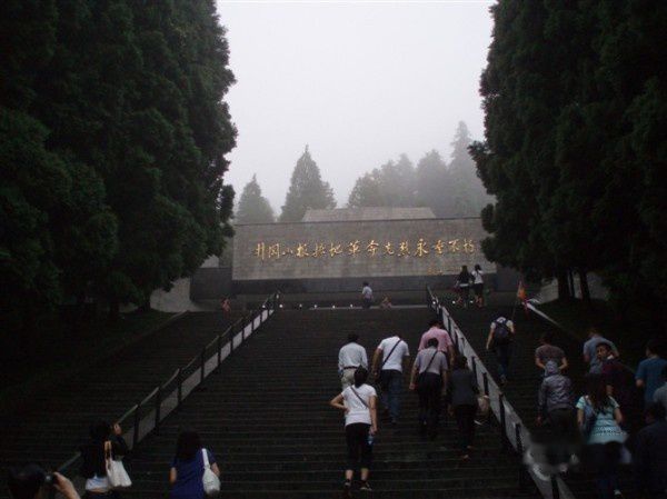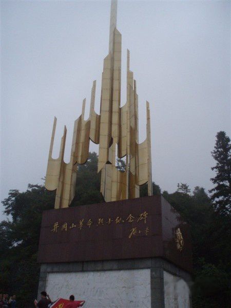 9月2日一早,在酒店吃过早餐后,我们准备开始了我们的井冈山之旅。首先我们前往“井冈山革命烈士陵园”。 到达陵园,人自然变得肃穆起来,一种崇敬从心理油然升起。 陵园由四大部分组成:纪念堂、碑林、纪念碑、雕塑园。烈士纪念堂内存放着井冈山斗争时期为革命英勇捐躯的烈士的遗像。 踏上长长的阶梯,我们一步步向烈士的英雄事迹靠近。进入纪念堂,导游开始为我们讲述烈士的英雄事迹,讲到精彩处伤心处,听者无不佩服感叹和惋惜。听完纪念堂里烈士的事迹,来到碑廊,沿着阶梯上行,看到周围很多一些重要的国家领导人及老红军的墨宝,写下了对英雄的缅怀,对井冈山的赞美。 顺路一直前行,就看到了纪念碑,那象征着“星星之火可以燎原”的雄伟纪念碑,下书的“井冈山革命烈士纪念碑”为邓小平同志所题。 停驻碑前,大家开始留影纪念。 站在纪念碑的位置,可以俯瞰井冈山的全貌,但由于下雨,远望出去什么都看不清,所以没拍下井冈山的美景。