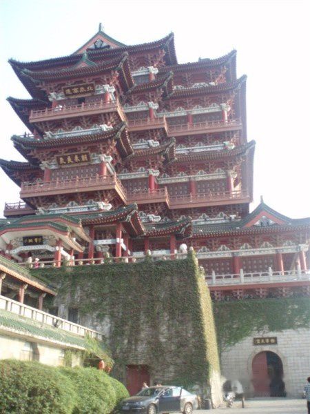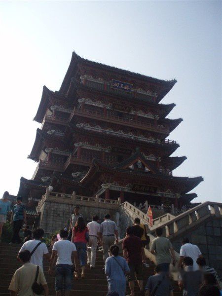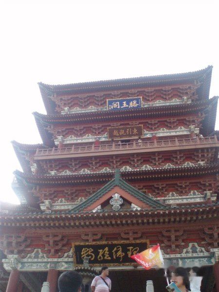 导游说:来到南昌不登滕王阁,就是白到了南昌。于是我们穿过八一广场、八一纪念馆,来到了江南三大名楼之首的滕王阁。滕王阁始建于唐代,一千多年来屡毁屡建,至今已达二十八次之多,有“国运昌则楼运盛”之说。滕王阁的建筑特色与众不同,有着“飞阁流丹,下临无地”之气势,所以名扬四海、众所皆知,引得历代不少名士到这里来游览、吟诗作对。王勃一篇《滕王阁序》便冲破云霄、一鸣惊人,博得十几代人的青睐,被认为是难得一见的千古佳作。文学家韩愈撰文:“江南多临观之美,而滕王阁独为第一,有瑰丽绝特之称。”故其有“江西第一楼”之誉,因其高度和面积都胜于其它阁楼,所以被列为我国江南三大名楼之首。