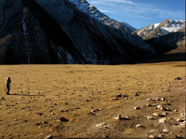 大约两个小时后,开始看到积雪的山巅,以及连片金黄灿灿的高山草甸。